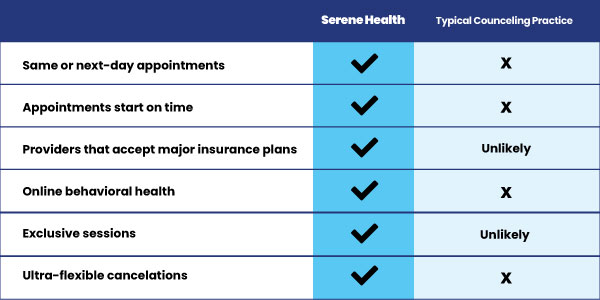 One of the biggest reasons why patients like yourself go without care is due to the inability to see their providers. Mental health affects the way we think, feel and act. It also helps determine how we handle stress, relate to others, and make choices. Mental health is important at every stage of life, from childhood and adolescences through adulthood. Serene Health is solving this issue by putting your mental health first and focusing on treating the whole person, with ample appointment availability through our Telehealth platform.
